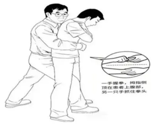 让患者坐着或站着,施救者从背后环抱住患者,一手握拳,一手抓住握住拳头的手,用力、快速地冲击患者腹部。此时患者应低头张嘴来配合施救者。