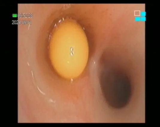 通过电子支气管镜仔细探查患儿的支气管,发现了卡在右主支气管的祸患,初步评估为一个圆柱形塑料,周围有分泌物覆盖,局部气管粘膜充血水肿明显,这个异物呈圆形,坚硬且表面光滑,紧紧地卡在患儿右主支气管,若治疗不及时容易发生气道梗阻甚至窒息,所以取出异物迫在眉睫。