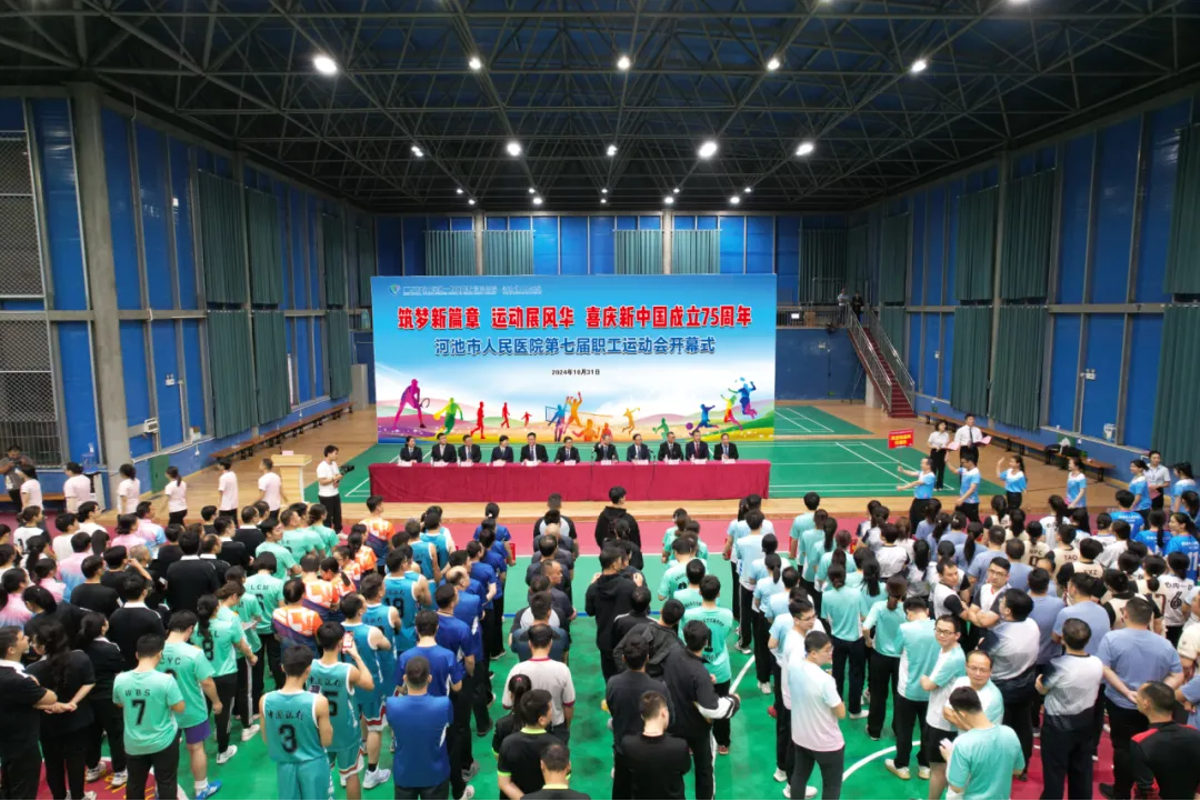 2024年10月31日晚,广西医科大学第一附属医院河池医院·河池市人民医院第七届职工运动会开幕式在中山院区职工健身活动中心举行。河池市人民医院领导班子、全体运动员、裁判员、相关工作人员以及特邀参加项目比赛的河池市卫生健康委员会、河池市中心血站、河池市第四人民医院、中国银行股份有限公司河池分行、金城江区河南社区卫生服务中心、金城江区六圩镇卫生院领导和运动员共赴这场激情洋溢的运动会。
