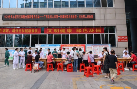 为促进心血管疾病的预防,普及群众心脏健康维护意识,9月29日上午,广西医科大学第一附属医院河池医院•河池市人民医院心血管内科一病区、二病区在总部院区门诊综合楼前开展2024年“心行合一 健康相伴”9.29世界心脏日暨全国科普日义诊志愿服务活动,吸引了百余名群众前来咨询。