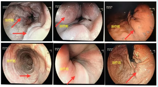 患者治疗前后胃镜检查图对比,食管曲张静脉明显收缩