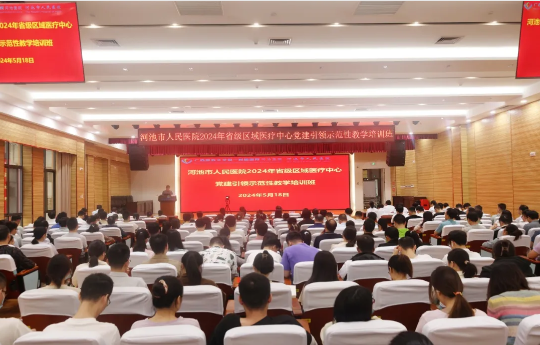 5月18日,河池市人民医院举办2024年住院师资培训暨自治区级区域医疗中心党建引领示范性教学培训班。培训班特邀广西医科大学第一附属医院党委副书记赖铭裕及其团队进行住培师资培训,河池市人民医院领导班子、住培带教老师、住培管理人员及全体住培学员参加培训班。