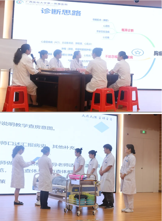 此外,授课专家团队还精彩地进行了小讲课展示和教学查房演示。广西医科大学第一附属医院曾雯老师通过其精彩的小讲课,生动地展示了小讲课的规范流程、授课的精妙技巧,以及详细阐述了如何有效开展师生互动、如何巧妙地将课程思政内容融入教学活动等方面,并给予了专业的指导;而全科专业基地教学主任杨霞的教学查房展示则严格按照规范的教学查房流程,从查房前的准备、查房中的指导、查房的方法到查房的效果等各个方面都进行了极具示范意义的演示,且着重强调要注重与学员的互动交流以及采用启发式教学,以充分锻炼学员的独立临床思维能力。