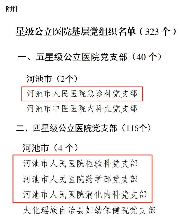 日前,自治区卫生健康委党组、自治区党委组织部公布了星级公立医院基层党组织名单,河池市人民医院4个党支部光荣上榜!其中,急诊科党支部被命名为“五星级公立医院党支部”,检验科党支部、药学部党支部和消化内科党支部被命名为“四星级公立医院党支部”。