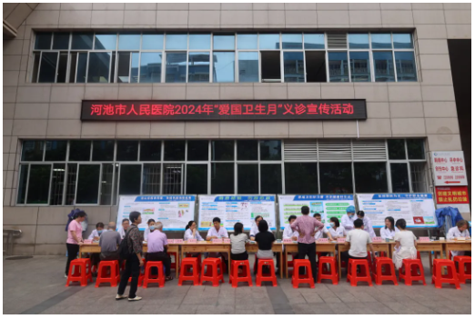 2024年4月是第36个“爱国卫生月”,主题是“健康城镇,健康体重”。为深入实施健康广西战略和健康广西行动,持续推进爱国卫生运动,4月26日,河池市人民医院在医院门诊综合楼前开展“爱国卫生月”宣传义诊活动。