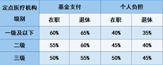 在一个参保年度内,参保人员在定点医疗机构门诊就医发生的属于基本医疗保险支付范围的医疗费用,在统筹基金起付标准以上、支付限额以下的,由统筹基金和个人按下列比例分别负担: