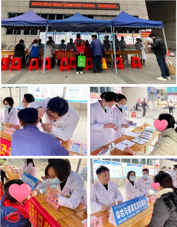 2024年3月3日是第二十五个“全国爱耳日”。当天,河池市人民医院在医院综合大楼门前开展主题为“科技助听,共享美好生活”的“爱耳日”宣传义诊活动,旨在提升群众对耳部健康的保护意识,普及科学爱耳护耳的知识。