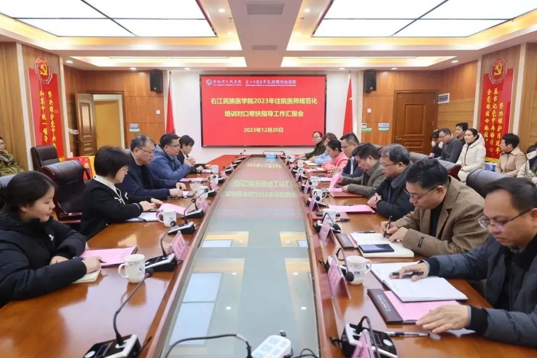 12月20日,右江民族医学院附属医院专家组到河池市人民医院开展对口帮扶住院医师规范化培训(简称“住培”)评估指导工作。住培评估指导汇报会和反馈会在教学综合楼7楼党员活动室召开,右江民族医学院附属医院专家组成员、河池市人民医院领导班子成员、科研教学管理科住培管理人员、专业基地管理人员参加会议。
