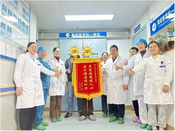 在医护人员的专业诊疗和悉心护理下,覃先生的病情逐渐好转,住院的第14天顺利成功撤除ECMO,第20天顺利撤除机械通气,第26天转至康复医学科继续进行康复锻炼治疗。出院当天,覃先生和他的儿子专程为科室送来了锦旗,感谢医护人员的救命之恩。