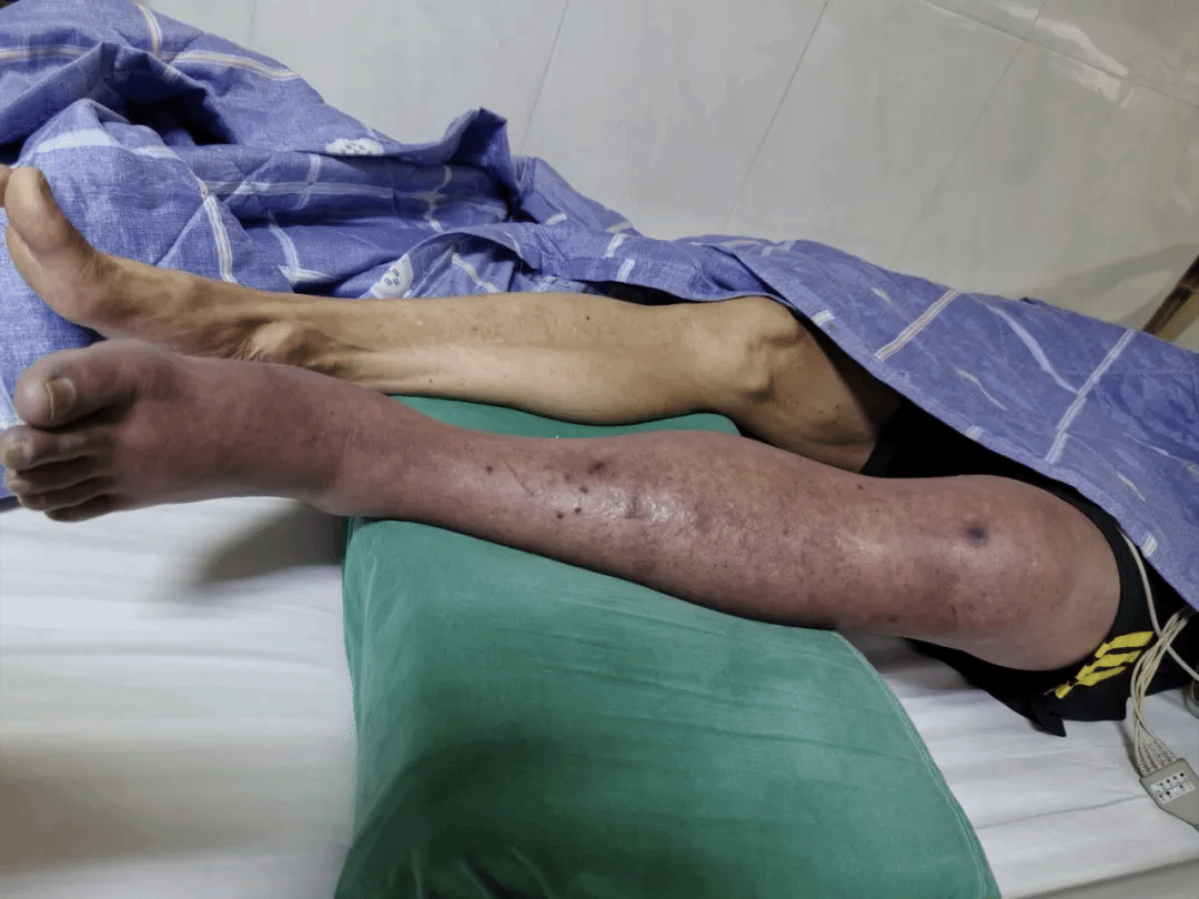 据了解,该名患者因突发左下肢麻木疼痛、皮肤青紫伴水肿迅速加重到当地医院就诊,下肢动静脉超声检查结果提示其左下肢深静脉血栓形成,建议立即转到上级医院。患者被紧急送到河池市人民医院时,其左下肢已出现血液循环障碍,整个下肢青紫发黑,左足背动脉未能触及,这是下肢静脉血栓形成的极罕见的“股青肿”,随时导致下肢缺血坏死,甚至面临截肢风险。