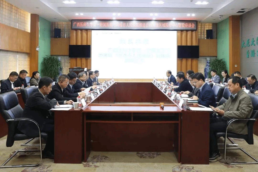 3月20日下午,河池市人民医院党委副书记、院长唐秀革带队一行11人就推进自治区级区域医疗中心建设工作到广西医科大学第一附属医院座谈、交流。广西医科大学第一附属医院党委书记李浪、院长郑宝石、副院长何松青,以及相关科室主任、职能部门负责人出席会议。