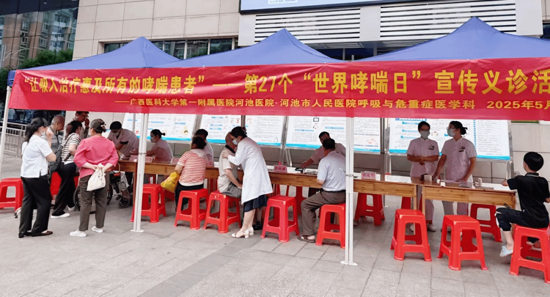 5月6日是第27个世界哮喘日,为提高广大患者防治哮喘的意识,倡导规范化、科学化诊疗模式,当天上午,广西医科大学第一附属医院河池医院·河池市人民医院呼吸与危重症医学科围绕“吸入疗法,全民可及”的主题,在总部院区门诊大楼前开展“世界哮喘日”义诊活动。