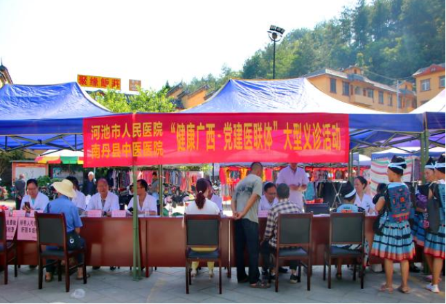 8月13日,河池市人民医院携手南丹县中医医院到南丹县里湖瑶乡为脱贫户、监测户等广大老百姓开展“健康广西•党建医联体”义诊活动。