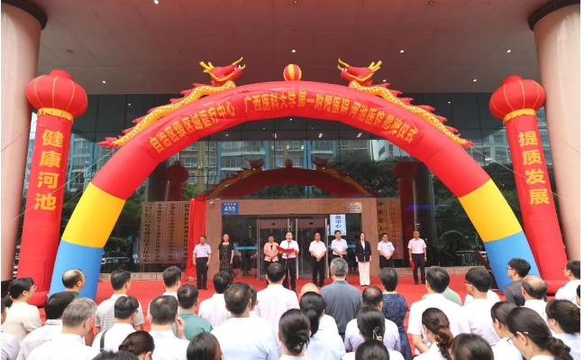 8月28日,自治区级区域医疗中心建设项目启动暨广西医科大学第一附属医院河池医院揭牌仪式在河池市人民医院门诊综合楼大门前举行。这是广西获得国家批复建设的4个自治区级区域医疗中心之一,对优化医疗资源配置,带动区域医疗水平整体提升,形成立足河池、辐射桂黔地区医疗服务水平新高地具有重要意义。