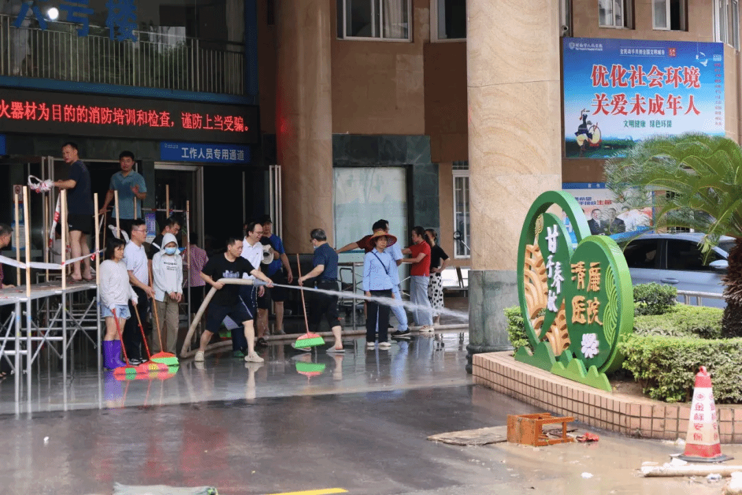 在清淤现场,党员干部冲锋在前作表率,纷纷拿着扫帚、木耙,配合高压水枪冲洗黏附污渍,合力清扫积水、淤泥和散落的垃圾,将各类物资、设备整理归位。大家齐心协力、分工明确,受积水影响的住院部、药房等部门逐渐恢复正常运行状态。