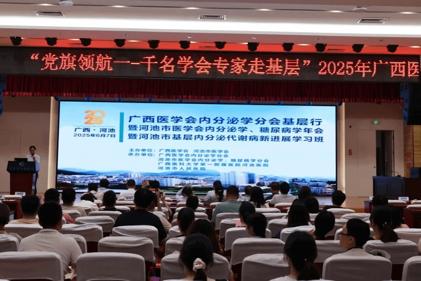 近日,广西医科大学第一附属医院河池医院·河池市人民医院主办的“党旗领航——千名学会专家走基层”2025年广西医学会内分泌学分会基层行暨河池市医学会内分泌学学术年会、河池市基层内分泌代谢病新进展学习班在河池市人民医院举行。本次学习班特邀中山大学附属第三医院姚斌教授、南方医科大学珠江医院陈宏教授、郑州大学第一附属医院秦贵军教授等国内知名专家进行专题授课。会议吸引了200余名内分泌领域权威专家及基层医护人员参加。