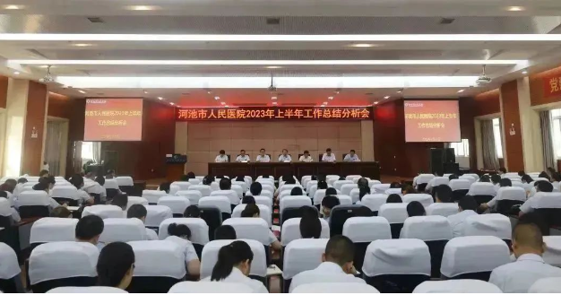 7月21日下午,河池市人民医院在门诊综合楼23楼会议室召开2023年上半年工作总结分析会。院领导班子成员、全体中层干部参加会议,会议由医院副院长余乐周主持。