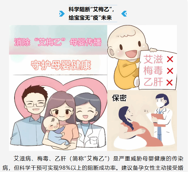 艾滋病、梅毒、乙肝(简称“艾梅乙”)是严重威胁母婴健康的传染病,但科学干预可实现98%以上的阻断成功率。建议备孕女性主动接受婚前医学检查和孕前优生健康检查,以便及时发现感染情况。