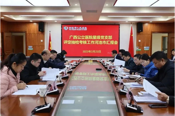 为推动公立医院五星级党支部考察核实、集中评定工作落到实处,2月23日上午,由自治区卫生健康委体制改革处处长王海涛为组长的星级党支部评定抽检考核组一行5人来到河池市人民医院,对我院推荐的五星级党支部进行现场考核。河池市卫生健康委副主任蓝如料、河池市委组织部组织四科科长唐丽萍、河池市人民医院党委书记韦义甜及相关部门负责同志陪同检查。