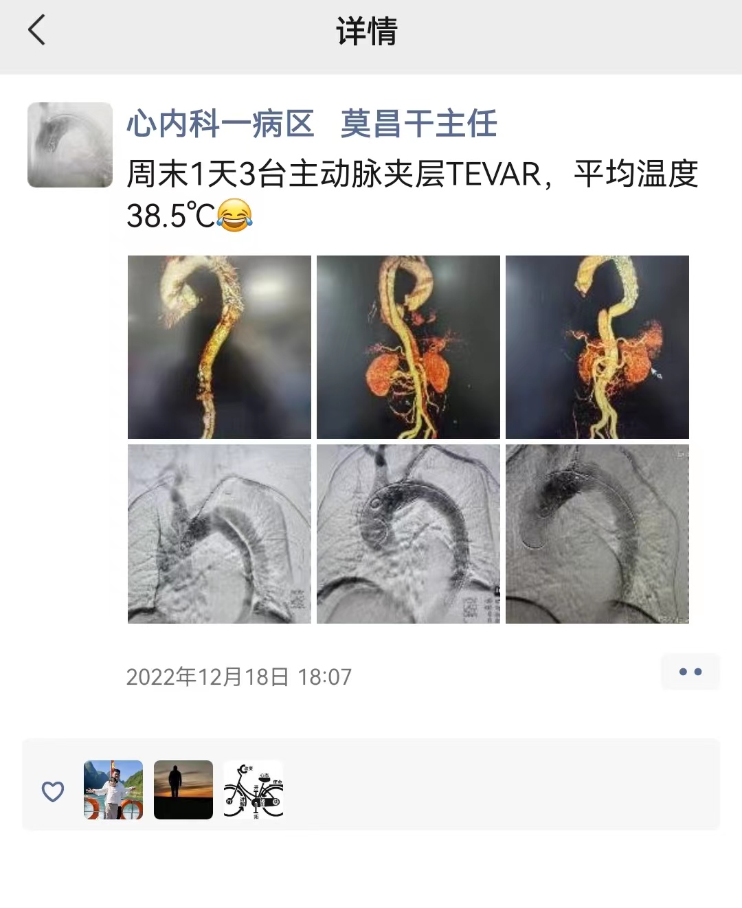 12月18日,心血管内科一病区主任莫昌干也以身作则,在自己发热38.5度的情况下在“阵地”倔强坚守,因为“病人等不起”“手术等不起”。手术顺利完成后,他在朋友圈打趣说:“周末1天3台主动脉夹层TEVAR,平均温度38.5°C”。在家休养时,他仍想着希望快点“满血复活”,因为还要“搬砖”。