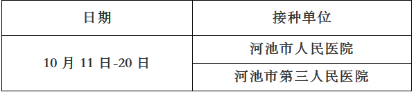根据河池市金城江区新冠病毒疫苗接种工作专班安排,2022年10月11日至10月20日新冠疫苗接种安排如下,请各位民众根据需求选择新冠疫苗接种点接种。
