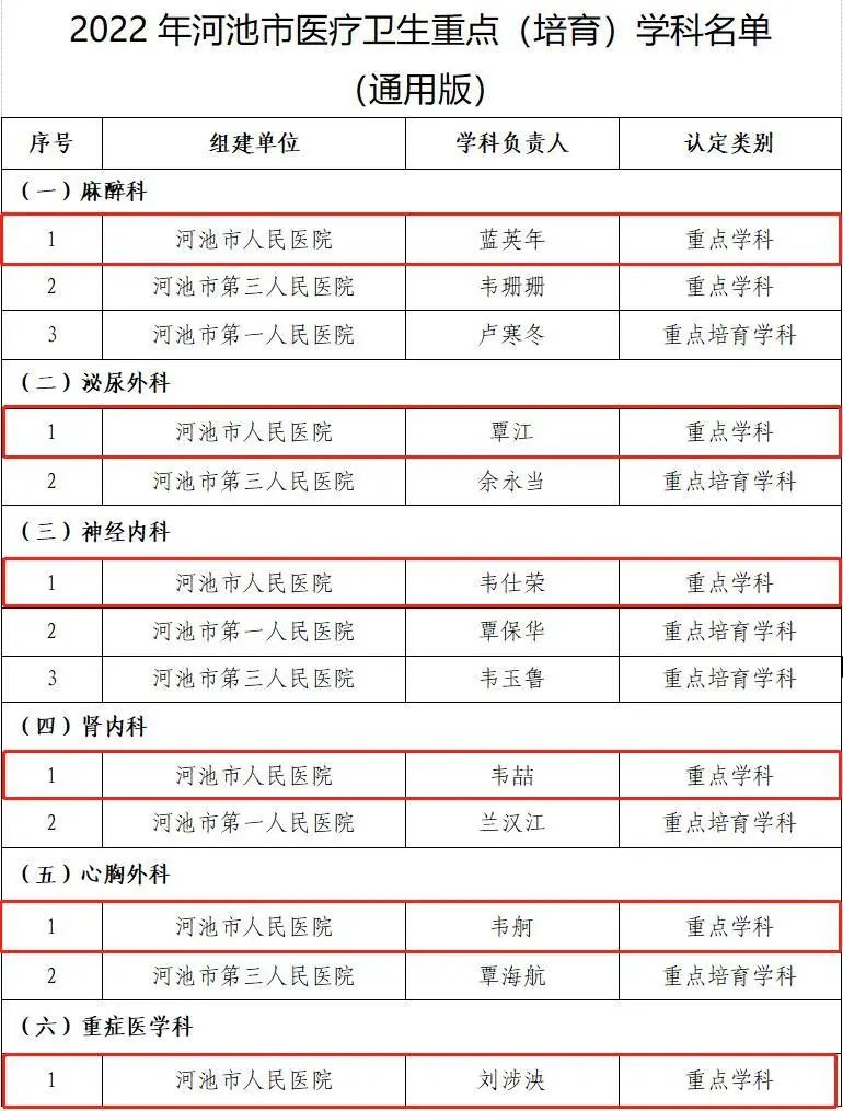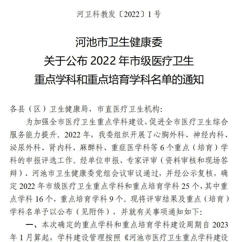 近日,在河池市卫生健康委公布的2022年河池市医疗卫生重点学科和重点培育学科名单中,河池市人民医院麻醉科、泌尿外科、神经内科、肾内科、胸心血管外科、重症医学科榜上有名,获批河池市医疗卫生重点学科。一次性获评6个市级重点学科,标志着河池市人民医院在学科建设、医疗水平、科研创新等方面再上新台阶。