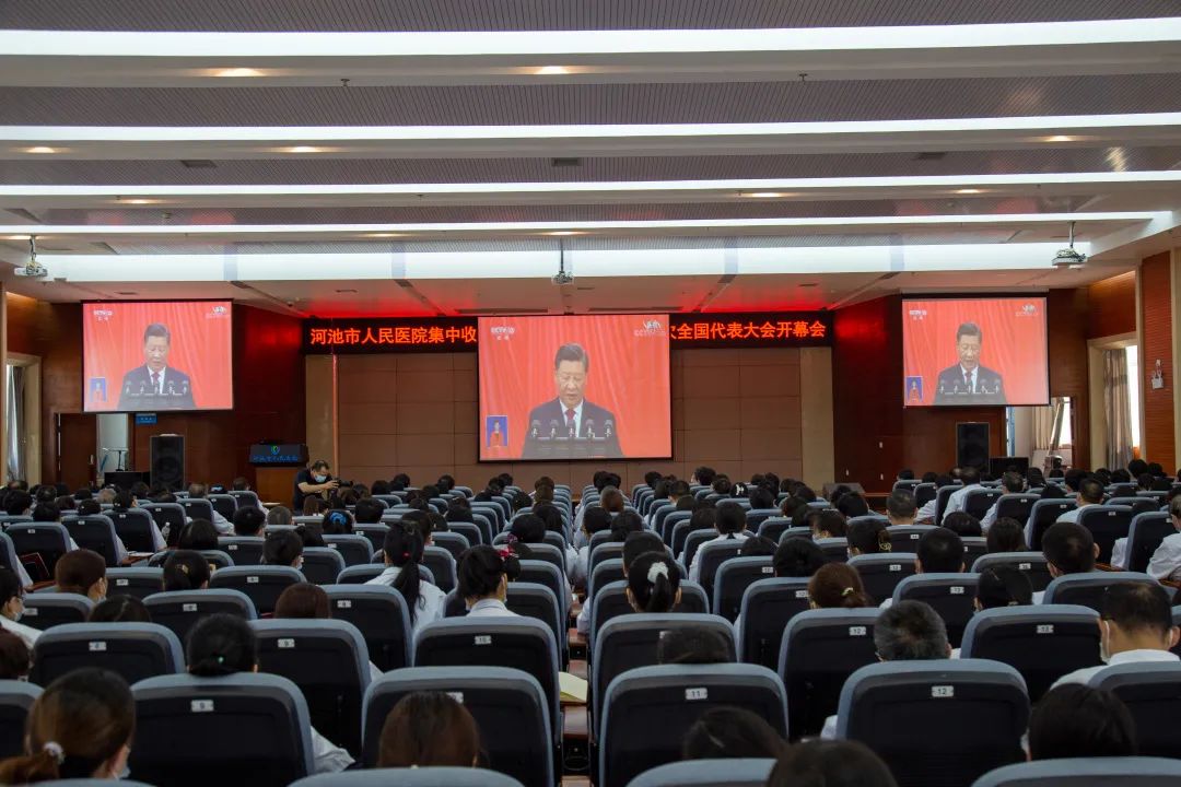 河池市人民医院党委高度重视党的二十大开幕会收听收看工作,认真制定方案,广泛动员部署,积极组织全院党员干部在门诊综合楼23楼集中收听收看开幕会直播,各科室、各党支部根据工作实际,组织党员、职工通过电视、网络、学习强国等平台观看大会。