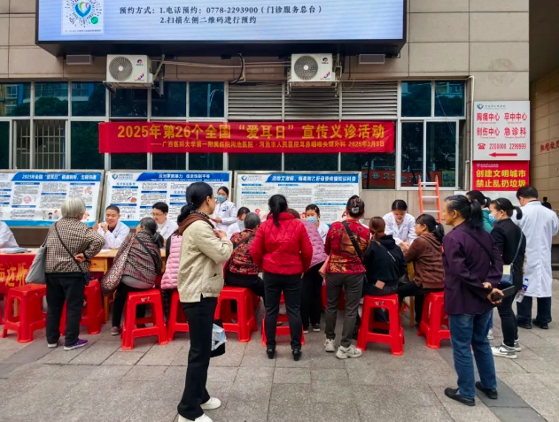 2025年3月3日是第26个全国“爱耳日”,为提升公众对耳部健康的重视,促进健康生活的普及,当天上午,广西医科大学第一附属医院河池医院·河池市人民医院耳鼻咽喉头颈外科联合眼科、口腔科、儿科、体检科在门诊综合大楼前开展“全国爱耳日”宣传义诊活动。