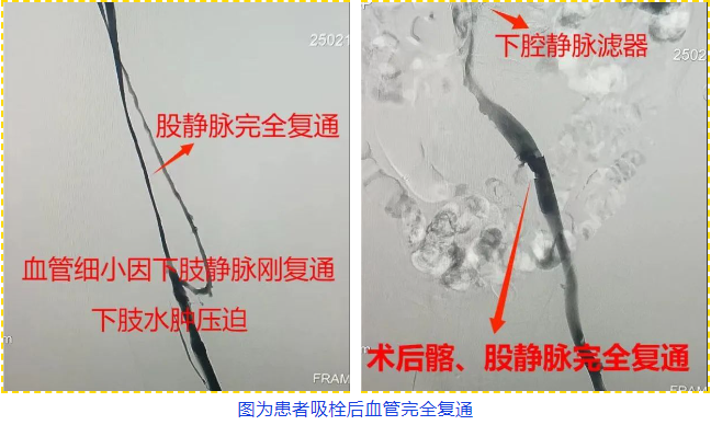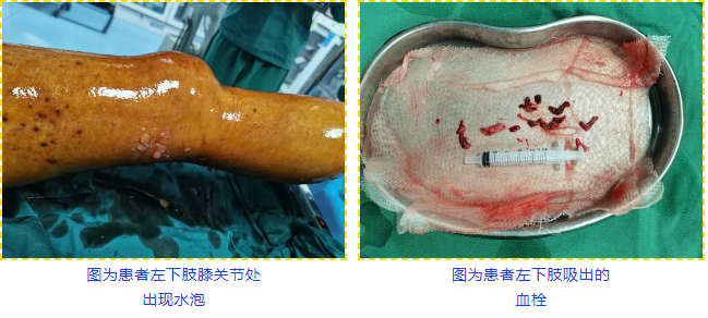 术中,手术团队发现患者左下肢膝关节处已经出现水泡,说明下肢静脉血栓堵塞进一步加重,立即通过下肢静脉造影精准定位血栓,以导管抽吸结合药物溶栓技术“双管齐下”清除血栓,同时置入下腔静脉滤器预防肺栓塞。历经2个多小时,手术团队们成功打通了闭塞血管,患者下肢血运即刻改善,青紫症状肉眼可见消退。经过术后5天抗凝及保守治疗,患者左腿基本恢复正常,目前患者已康复出院。