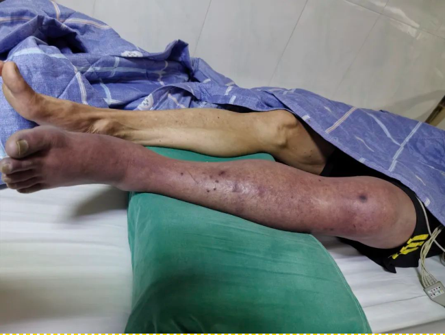 据了解,该名患者因突发左下肢麻木疼痛、皮肤青紫伴水肿迅速加重到当地医院就诊,下肢动静脉超声检查结果提示其左下肢深静脉血栓形成,建议立即转到上级医院。患者被紧急送到河池市人民医院时,其左下肢已出现血液循环障碍,整个下肢青紫发黑,左足背动脉未能触及,这是下肢静脉血栓形成的极罕见的“股青肿”。随时导致下肢缺血坏死,甚至面临截肢风险。
