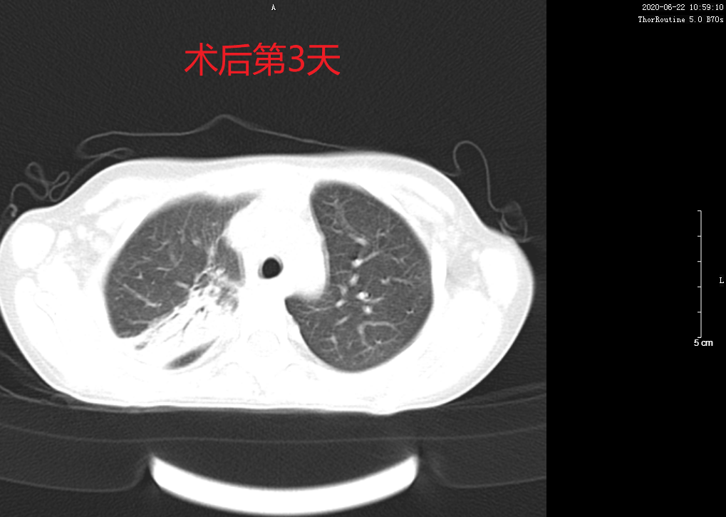 本次支气管镜术在PICU(儿童重症监护室)内密切监护的条件下,进行局麻镇静,使患儿安静睡眠后行支气管镜检查,支气管镜经右鼻腔进入肺部进行治疗,整个操作过程顺利,患儿无不良反应,病情平稳。术后两天患儿咳嗽症状消失,第3天复查胸部CT病灶较前明显吸收,疗效显著。