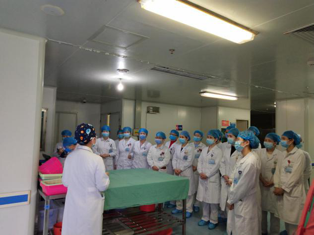参观人员分两批次进行。首先,唐喜艳护士长带领大家参观了科室内环境布局、设备设施,介绍消毒供应中心十大工作流程,并重点讲解清洗、消毒、包装、灭菌、发放等操作流程以及手术器械的使用范围。
