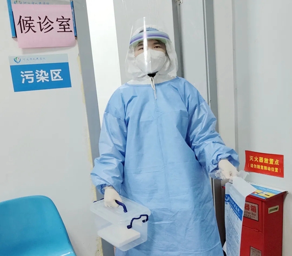 在隔离病区里,总能看到蒙榕榕忙碌的身影。因为要穿着密不透风的防护服,送水、送饭、测体温、测血压、输液……病房里来回两趟的功夫,汗水已浸湿了衣服,护目镜上也全是水珠。她从不忘记叮嘱患者多喝水,自己却为了节省时间、节约一件防护服,直到完成6个小时的工作后,才能换下湿透的衣服,安心的喝上一杯水。她说“我热爱这座城市,我愿为它坚守“疫”线,疫情不退,我们不退!”