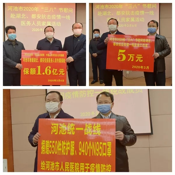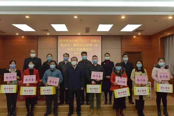 全民抗击新冠肺炎疫情已进入关键时期,春暖三月,草长莺飞,恰逢“三八”妇女节即将到来,2020年3月6日上午,市委副书记、统战部部长唐标文、统战部副部长陆定康、市委副秘书长钟云、市卫健委主任韦东禄、市妇联主席谢小菊到我院慰问了赴湖北、都安抗击疫情医护人员及家属代表,市人民院院长唐秀革、党委书记韦义甜、副院长韦喆及相关职能部门陪同慰问。
