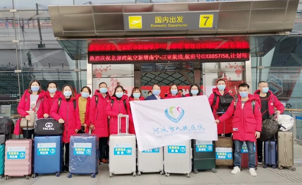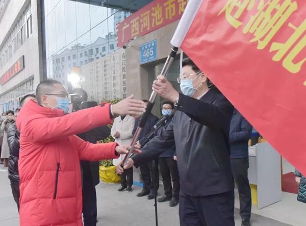 2月19日上午8时许,河池市第一批援鄂医疗队出征仪式在河池市人民医院门诊综合大楼前隆重举行。此次医院通过层层筛选,最终确定由12名医护人员组成医疗队,其中7名中共党员,奔赴武汉疫情防控救治一线支援。