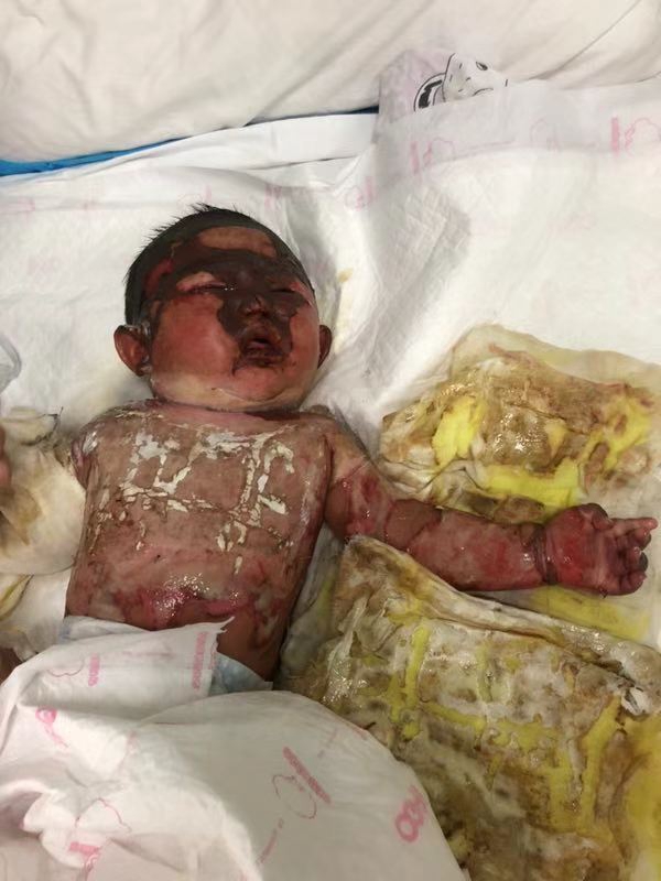 12月3日晚,贵州省三都县周覃镇的一个村庄里,赫爷爷正在给小赫赫准备洗澡水,刚把滚烫的热水倒进浴盆,还没来得及加冷水,小赫赫就扑进了热水里,导致头面颈、躯干、双上肢等多处烫伤。被烫伤的小赫赫由于身体疼痛而哭闹不止,慌乱中的家长来不及多思考,立即将小赫赫送至荔波县人民医院急诊科。由于烫伤面积大,情况严重,当地医院建议转上一级医院治疗,得到小赫赫父母的同意后,当地医院立即与我院联系,将小赫赫送至该院进一步治疗。