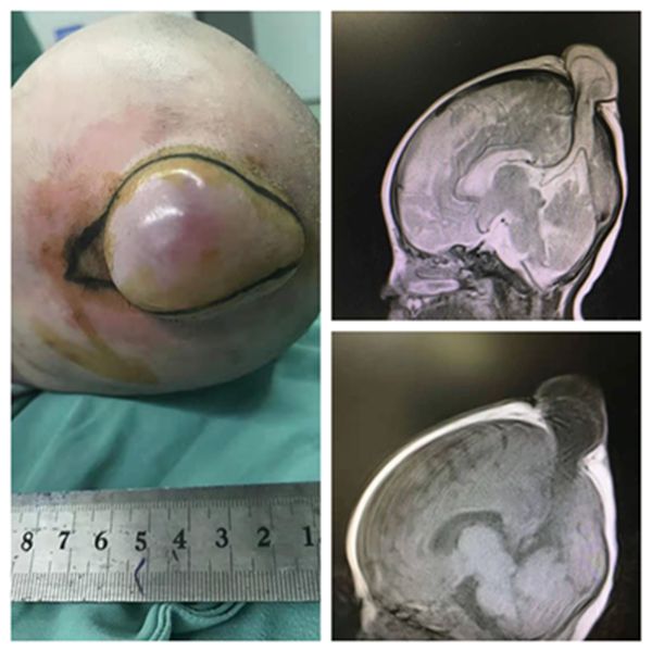2月25日,我院神经外科收治了一名叫桐桐(化名)的小宝宝。在桐桐出生的时候,被发现枕部有一拇指大小的肉瘤凸起,一开始大家以为和经常见到的“小耳朵”一样,所以都没有太在意。随着桐桐一天天长大,从枕后脑壳缝“钻”出来的“小肉”也在长,等到桐桐三个多月的时候,和鸡蛋那么大的“小肉肉”表层像是覆盖着一层薄膜,触碰时有很强的波动感,似乎稍加用就会破裂。这个脑壳缝让桐桐的父母很是担心,便将桐桐带到我院神经外科就诊。神经外科张传东主任从桐桐的头颅MR+DWI检查报告等检查证实:桐桐为顶部脑膜膨出,建议桐桐进行手术治疗。
