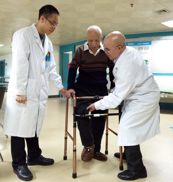 因刘老合并有左下肢股总、股浅静脉血栓,为防止栓子脱落,引起肺栓塞等风险。在征得家属同意后,市人民医院胸心血管外科的专家先为他放置了下腔静脉滤器。一切准备就绪后,脊柱关节骨病外科及麻醉科手术室医护人员于11月16日顺利为刘老进行了髋关节置换术,并在术后立即跟进快速康复措施,为刘老进行病情观察、超前镇痛、血栓评估及预防、肌力及关节松动训练等治疗,刘老麻醉清醒后,即给予饮水、饮食。在医护人员的精心护理下,刘老的身体逐步恢复,术后第一天,就能在床上坐起,第二天便能完成床边站立等动作,第三天,刘老在助行器和医护人员的帮助下,迈开双腿行走。