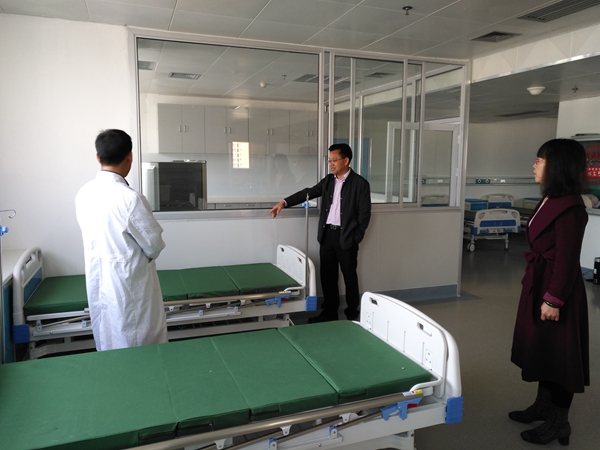 在呼吸内科ICU 建设现场,梁涛院长在听取呼吸内科介绍后,要求各职能科室要按照“4月14日正式启用运行”的要求,及时调配好人员,党政办、医械科、信息科、财务科、基建办、后勤办要及时完善有关配套设施、调试好相关设备,确保呼吸内科ICU如期启用。