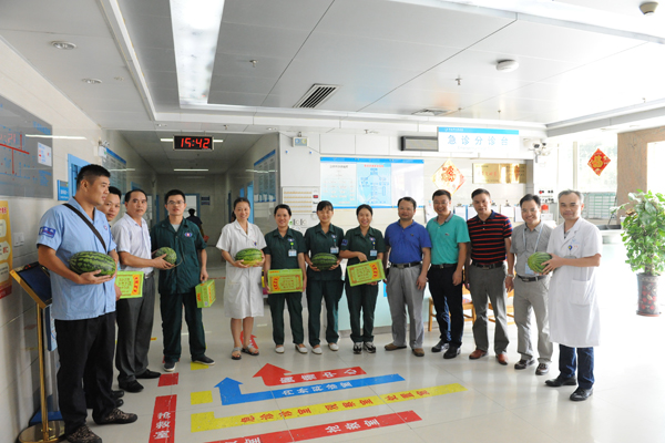 8月23日下午,医院党委书记韦义甜、党委副书记、纪委书记韦克波、副院长唐秀革以及工会主席黄天国等领导分别率队前往急诊科、司机班、保安组、水电班及儿科中心和中山路住宅小区项目工地进行送清凉慰问活动。慰问组给一线工作人员送去了西瓜、王老吉饮料等解暑品,并向他们致以亲切的问候。在现场,韦义甜书记一一将防暑降温用品送到施工人员手中,对他们头顶烈日、坚守岗位、一丝不苟的工作态度表示衷心的感谢和崇高的敬意,同时叮嘱他们要注意防暑,注意施工安全。