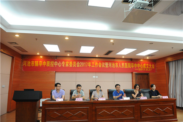 9月27日下午, 河池市脑卒中医疗质量控制中心专家委员会2017年工作会议暨市人民医院卒中中心成立大会在我院举行,市卫计委副主任欧乃坚,市人民医院院长、市脑卒中质控中心专家委员会主任委员梁涛,市四医院院长杨正广、市人民医院副院长蒋军松出席会议,南方医科大学南方医院姬仲博士、深圳市第二人民医院钟旗博士以及全市各医疗机构从事脑卒中防治工作的专家受邀参会。此次大会的召开标志着河池首个规范、高效的脑卒中绿色通道正式启动。