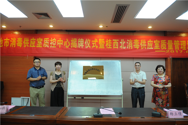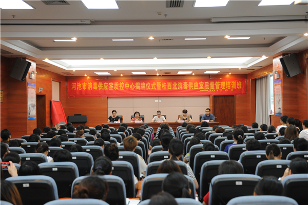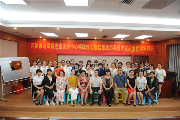 6月2日,河池市消毒供应室质控中心揭牌仪式暨桂西北消毒供应室质量管理培训班在我院举行,浙江大学医学院附属第二医院毛雅琴教授,广西医科大学第一附属医院消毒供应中心岑颖护士长,广西区人民医院消毒供应中心蒋松云护士长受邀为大家授课。市卫生计生委副主任蓝如料,我院副院长杨立倩、唐秀革出席本次培训班,桂西北地区各医院供应室150多名学员参加本次培训班。