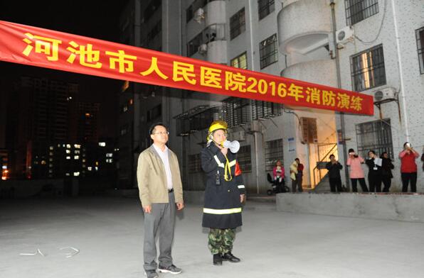为加强医院消防安全,提高全院干部职工应急处理突发事件和防灾救灾能力,11月29日,我院联合河池市消防支队开展大型消防演练,全市共出动8辆消防车,50余名官兵参加此次夜间实战演练。