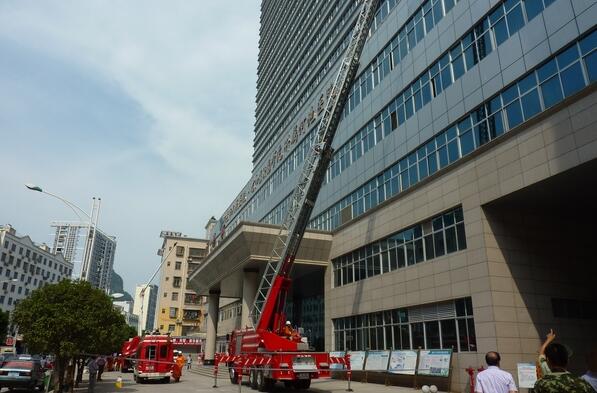下午3:00,门诊综合大楼9楼病房突然冒起的滚滚浓烟,四辆消防车迅速驶入医院,随后,消防队员立即拉起警戒线,火场侦察、水带铺设等工作也迅速有序展开。参加演练的人员也迅速做出反应,立即将病房内的病人进行紧急转移,他们用湿毛巾捂住口鼻在消防官兵的指挥下,迅速有序地从火区撤离,疏散至安全地。于此同时,全副武装的抢险队员利用登高平台消防车成功伸到9楼窗口位置,将人员顺利救下。整个历时近1个小时,消防演练顺利完成。