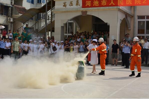 为进一步强化参演人员对消防知识的了解,消防官兵还向参演人员现场讲解灭火器、高压水枪的使用方法以及发现火灾如何进行自救和逃生等消防常识,部分医务人员还现场用干粉灭火器进行实际操作培训。