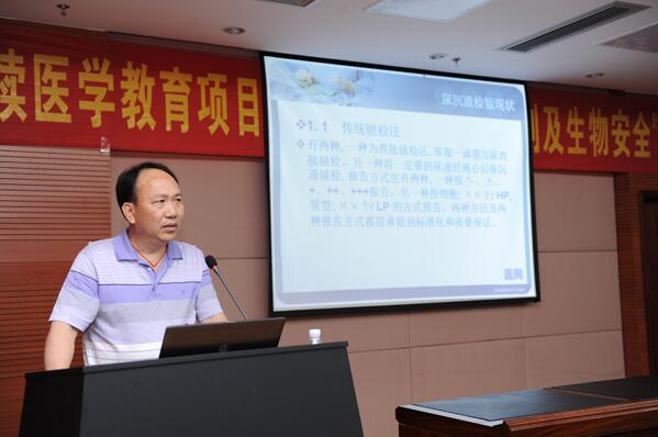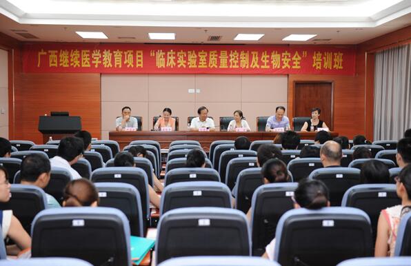 为进一步加强临床实验室检验质量及生物安全管理,推动地区各医院检验学科的建设和发展,7月6日,由我院检验科主办的自治区级继续医学教育项目《临床实验室质量控制及生物安全管理》培训班在门诊综合楼5楼学术报告厅举行。来自市区及各县(市)医院的检验科主任、业务骨干及从事检验工作的医技人员近100人参加了学习。学习班 由我院科教科副科长梁惠芳主持,副院长刘景发参加学习班并致欢迎辞。