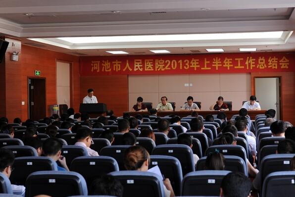 大会现场 文彪副局长讲话 7月19日,我院在门诊综合大楼5楼学术报告厅举行2013年上半年工作总结分析会,院领导、全院中层干部、班组长、总住院医共300余人参加会议。会议由刘景发副院长主持。