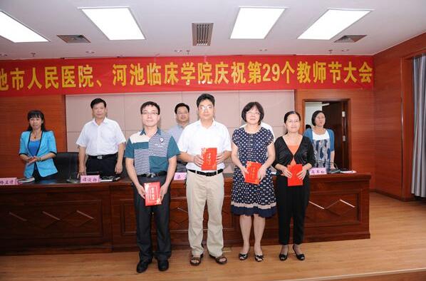 为总结临床教学经验,查找工作不足,也为了表彰教学工作先进者,9月6日下午,我院在门诊综合大楼5楼多功能会议室举行庆祝第29个教师节大会,院领导、全院中层干部,各教研室主任、教学秘书,实习生及右江民族医学院临床本科班学生代表共180多人参加会议,会议由刘景发副院长主持。
