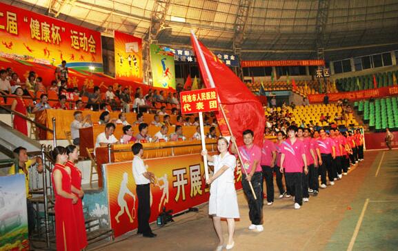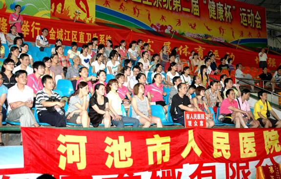 河池市卫生系统第二届“健康杯”运动会于2011年5月26日至29日在金城江隆重举行。我院组队参加了男女篮球、气排球、羽毛球等全部项目的比赛,取得了优异的成绩:男子篮球荣获比赛第一名、男女混合气排球荣获比赛第一名、女子篮球荣获比赛第二名,这是继2008年第一届“健康杯”运动会我院男、女篮球队双双荣获冠军后的再度辉煌,为医院争得了荣誉。