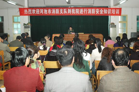 2010年12月1日下午,我院在三楼大教室举行消防安全“四个能力”建设知识培训。全院副护士长以上中层干部、行政后勤科室所有人员及临床医技科室人员共300多人参加了培训。本次培训由医院党委副书记、纪委书记、副院长谭俊扬主持,河池市消防支队防火处处长廖锡强主讲。